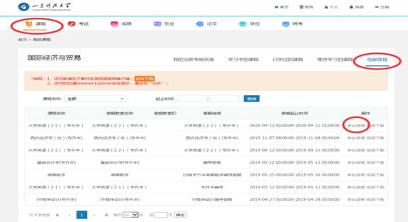 员工可从“通知公告”栏中查看本学期辅导答疑授课安排表,或者直接从“课程”标签进入视频答疑,根据答疑起止时间,当“参加答疑”为蓝色可用时,即可点击进入答疑教室,参加视频答疑。非答疑时间,“参加答疑”按钮为灰色。