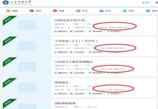 所有学习行为都将累计学习时间。当累计时间达到500分钟时,系统自动记录在线学习积分30分并计入期末考试总成绩。在主页上每门课后后面可查看已学习的总时长。