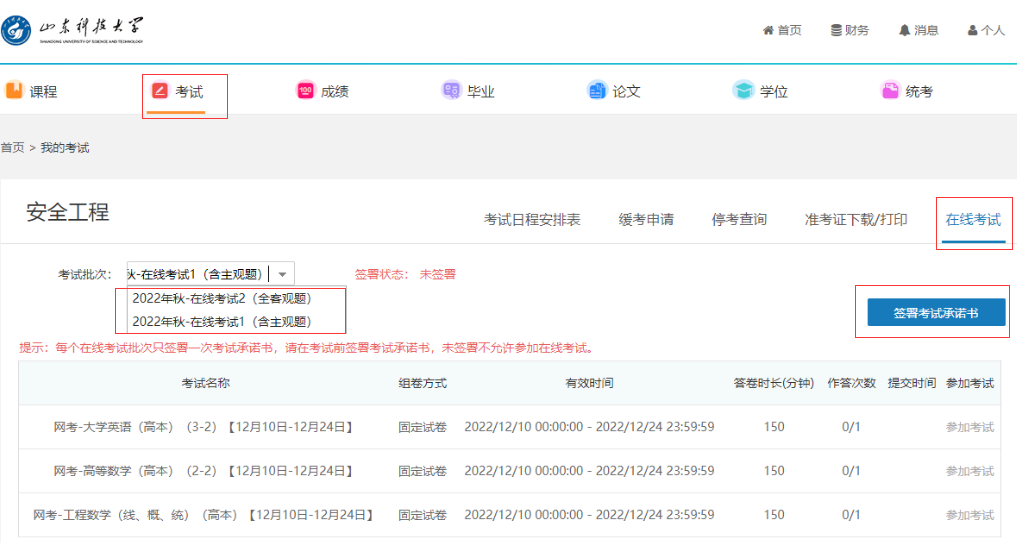 点击页面上方的“考试”,再点击页面右侧“在线考试”,核实考试批次 “2022年秋-在线考试1(含主观题)”和“2022年秋-在线考试2(全客观题)”,批次及考试科目核实无误后,再点击“参加考试”,考试正式开始。